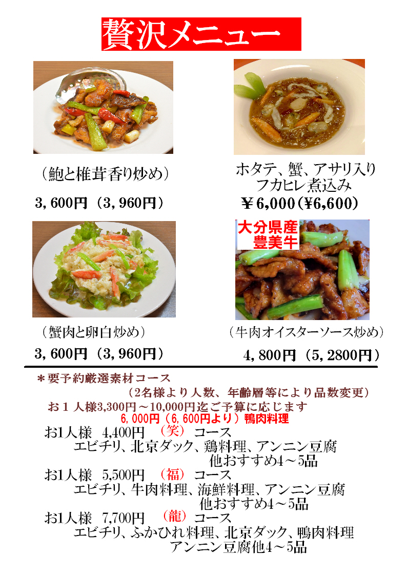 ●当店では大分県産の椎茸を使用した料理やエビ・甲殻類の使用した油は他の料理にも使っています。アレルギー等が気になる食材に関しては予めお尋ねください。